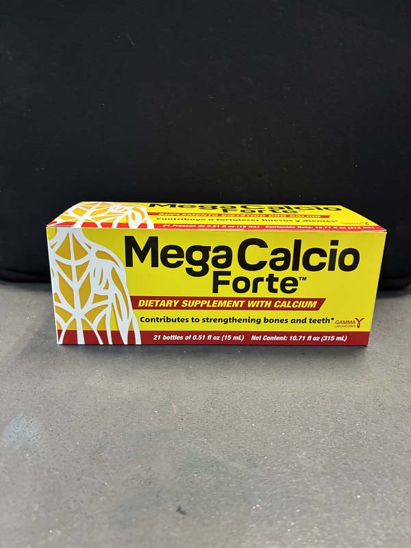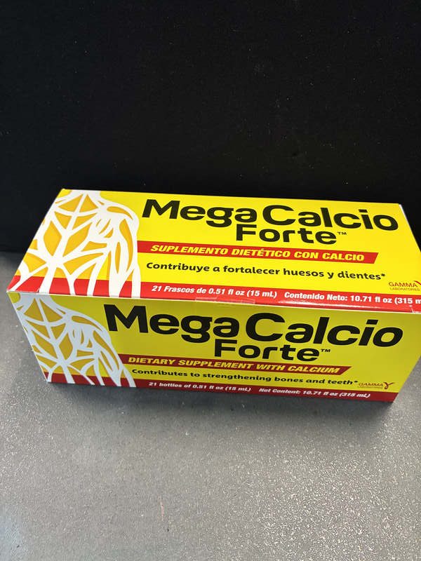 Mega Calcio forte is a drinkable dietary supplement, usually sold in packs of 21 single-serve bottles (0.51 oz/15 ml). It is formulated to strengthen bones and teeth while supporting the immune system. The liquid form provides a convenient, ready-to-drink option for adults looking to increase their calcium intake. Key Benefits of Mega Calcio Forte • Bone and Teeth Support: Helps maintain adequate calcium levels necessary for maintaining bone density and strong teeth. • Immune System Support: Formulated to contribute to a robust immune system. • Antioxidant Support: Includes antioxidants, which are crucial for overall health maintenance. • Convenient Liquid Form: Ready-to-drink vials make it easy to incorporate into daily routines, typically recommended as one bottle per day. Considerations • Usage: Designed for adults to help support a healthy and active lifestyle. • Storage: The product typically comes in 21 vials, offering a three-week supply if taken daily. • Side Effects: Excessive calcium intake, often from over-supplementation, may lead to kidney stones, constipation, and cardiovascular issues, so it is important to stick to recommended dosages